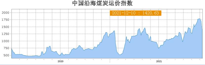本周,沿海煤炭航運價格大幅回落。截至12月9日沿海煤炭運價指數(shù)為1437.3,較上周同期下跌344.85點,跌幅19.35%;較上月同期下跌153.96點,跌幅9.68%;較去年同期上漲274.9點,漲幅23.65%。