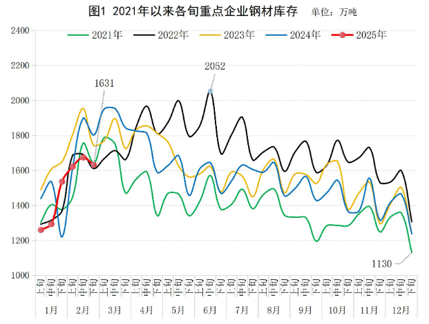 2025年2月下旬,重點統(tǒng)計鋼鐵企業(yè)(以下簡稱“重點企業(yè)”)鋼材庫存量1631萬噸,環(huán)比上一旬減少42萬噸,下降2.5%;比年初增加394萬噸,增長31.9%;比上月同旬增加96萬噸,增長6.3%;比去年同旬減少171萬噸,下降9.5%,比前年同旬減少111萬噸,下降6.4%(見圖1)。